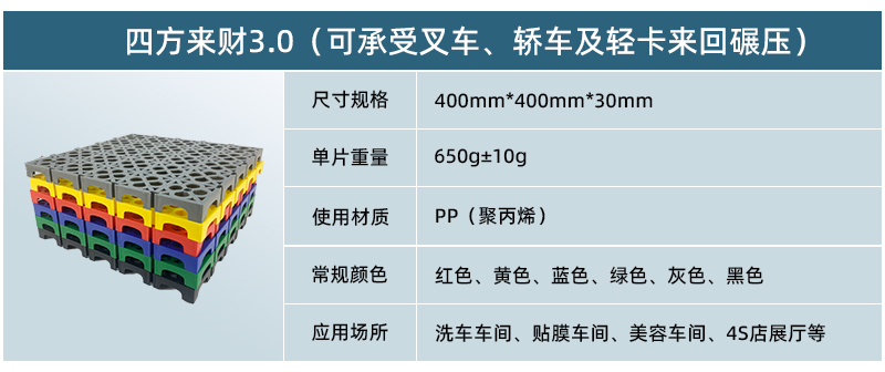 1. 分為3.4.5.厚度,解決不同厚度,統(tǒng)一紋路的問(wèn)題 2. 啞光平紋設(shè)計(jì),防滑,美觀,易清潔 3. 選用高級(jí)原料,加入其他輔料,顏色亮麗,無(wú)異味,無(wú)污染 4. 顏色為紅黃藍(lán)綠黑灰六色,滿(mǎn)足客戶(hù)用色需求,搭配屬于自己的風(fēng)格 5. 通扣鎖扣設(shè)計(jì),容易鋪設(shè)且容易拆卸打理 6. 加強(qiáng)支撐,不容易出現(xiàn)壓壞壓斷現(xiàn)象,滿(mǎn)足大多數(shù)車(chē)輛施工的要求 7. 使用年限長(zhǎng),五年超長(zhǎng)質(zhì)保,使用無(wú)后顧之憂(yōu) 8. 十字支撐,保證承載最大化的同時(shí),且易排泥排水