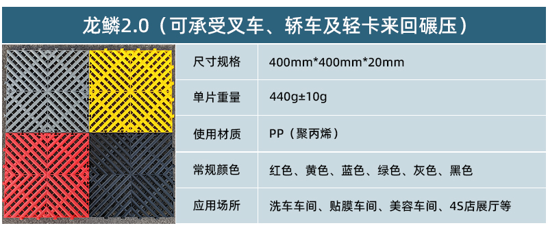 1.龍鱗紋設(shè)計(jì),防滑,美觀,寓意好 2.選用高級(jí)原料,加入其他輔料,顏色亮麗,無(wú)異味,無(wú)污染 3.顏色為紅黃藍(lán)綠黑灰六色,滿足客戶用色需求,搭配屬于自己的風(fēng)格 4.通扣鎖扣設(shè)計(jì),容易鋪設(shè)且容易拆卸打理 5.加強(qiáng)支撐,不容易出現(xiàn)壓壞壓斷現(xiàn)象,滿足大多數(shù)車輛施工的要求 6.使用年限長(zhǎng),3年超長(zhǎng)質(zhì)保,使用無(wú)后顧之憂 7.不同厚度,采用不同支撐,保證承載最大化的同時(shí),且易排泥排水